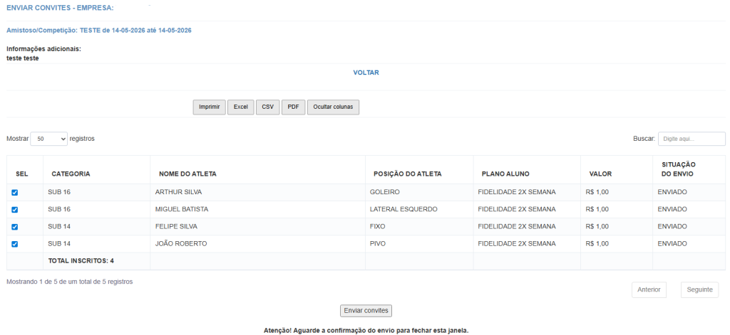 Selecione para qual amistoso ou competição irá o convite, confirme selecione os alunos que irão receber o convite e envie.