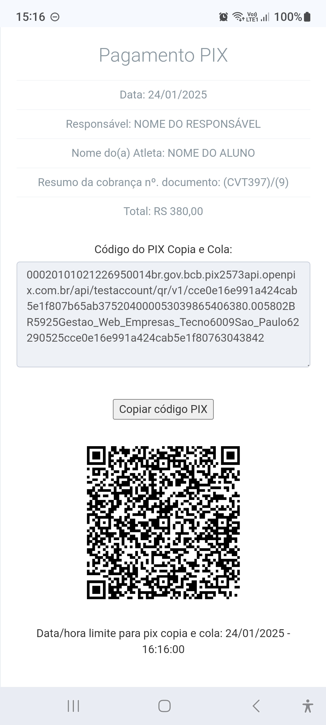 Será cobrada a taxa de serviço no valor de R$ 1,50 por operação (PIX), adicionado diretamente no valor da cobrança gerada para o responsável nos amistosos, convites para competições e na convocação para as competições. A cobrança da mensalidade do aluno pode ser configurada para cobrar adicionalmente no valor da cobrança ou deixar já no valor incluso que será cobrado do responsável.